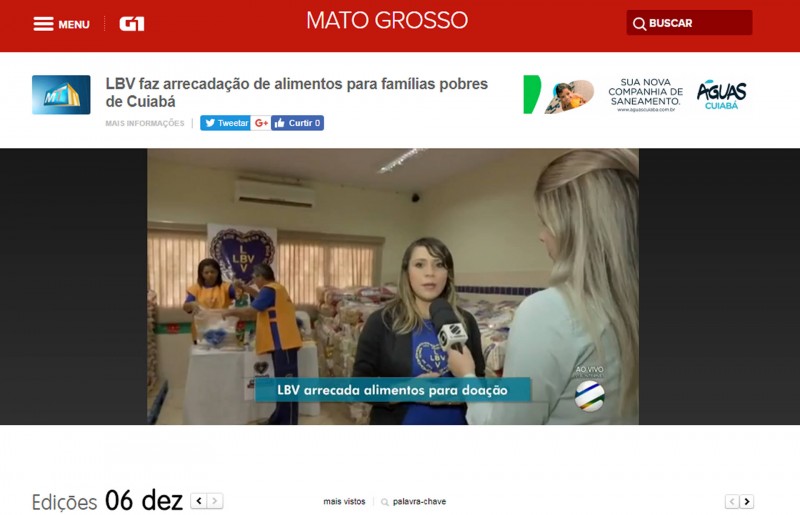 Nesta quarta-feira, dia 6, o Jornal MT TV (1ª edição) fez um link, ao vivo, direto do Centro Comunitário de Assistência Social da LBV, em Cuiabá/MT, para falar sobre as entregas das cestas de alimentos. A repórter Kátia Krüger conversou com a psicóloga Debora Mazur, que destacou o objetivo da campanha e convidou as pessoas a colaborarem com esta ação. A entrega será no dia 20 de dezembro e beneficiará cerca de 700 famílias.