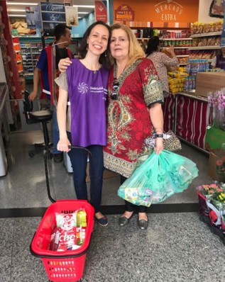 A senhora Neiva (D) é colaboradora da LBV e ficou feliz de encontrar a Instituição nessa ação. Doou vários itens para compor uma cesta de alimentos. Unidade Extra, no bairro Liberdade, em São Paulo/SP. Na foto, a voluntária Elisa Alonso.