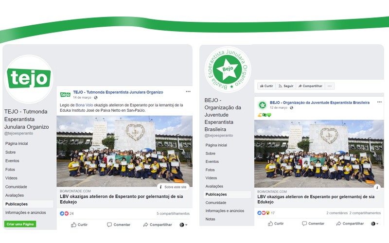 Fine, ni ankaŭ mencias la reliefigojn donitajn de la oficialaj retpaĝoj de Brazila Esperantista Junulara Organizo kaj de Tutmonda Esperantista Junulara Organizo ĉe sociretoj.