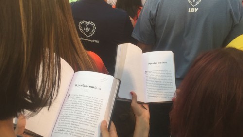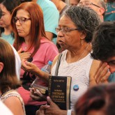 Público acompanha a leitura, feita pelo Irmão Paiva, das Sagradas Diretrizes Espirituais da Religião de Deus, do Cristo e do Espírito Santo, volume 1, no capítulo "O perigo continua", p. 259, destacando a importância de nos integrarmos no conceito Ecumênico e prático do Novo Mandamento de Jesus nos tempos atuais.