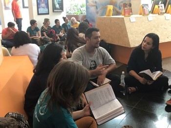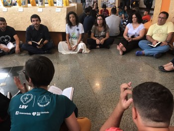 Os jovens leitores do escritor Paiva Netto estudam o capítulo "Quanto à morte" das Sagradas Diretrizes Espirituais da Religião de Deus, do Cristo e do Espírito Santo, primeiro volume, edição revista e ampliada pelo autor.