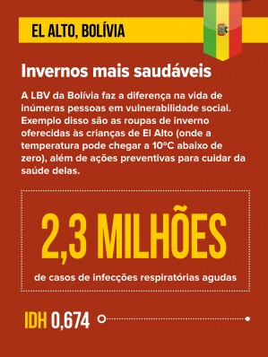 A campanha Inverno sem resfriado, da Legião da Boa Vontade da Bolívia, foi criada justamente para ajudar a evitar infecções respiratórias agudas na população infantil da área rural de La Paz. Em 2017, a LBV realizou essa ação na Unidade Educativa Villa Imperial, localizada na cidade de El Alto, no Distrito 7. Mais de 600 crianças de 1 a 12 anos foram beneficiadas. A iniciativa deu prioridade a elas, pois o sistema imunológico na fase infantil é mais frágil do que na adulta.