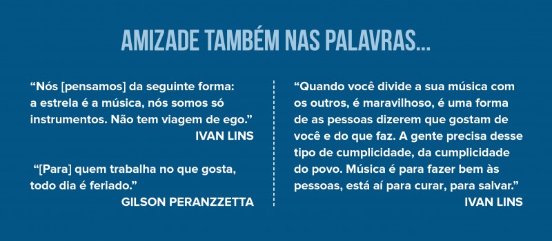 Essa total harmonia se explica pelo tempo que são amigos: já se vão mais de 45 anos, ou, como destacam os dois, desde que eram garotos. E o carinho e apoio mútuos ficam evidentes no decorrer da entrevista. Gilson fala da primeira vez que escreveu para orquestra: “Foi no [álbum] Somos todos iguais nessa noite, que gravamos na Odeon. O Ivan abriu essa porta para mim do arranjo, de me interessar pela orquestra; a chave estava com o Ivan, era o São Pedro. Foi um encontro maravilhoso”, relembrou o músico.