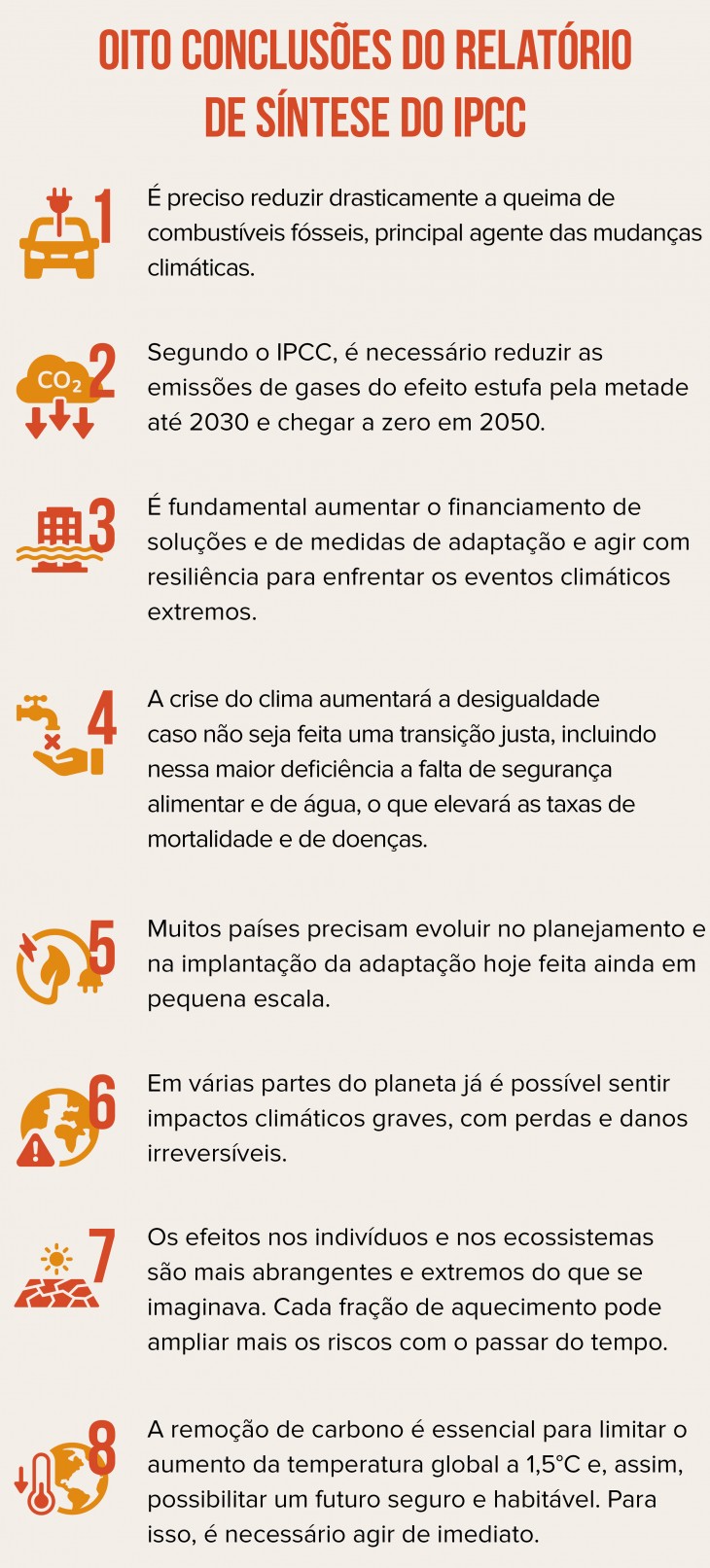 Um pouco antes, no dia 20 de março, o Painel Intergovernamental sobre Mudança do Clima (IPCC), da ONU, havia lançado o Sexto Relatório de Avaliação (AR6), que é o último volume da pesquisa de oito anos do corpo de cientistas mais destacados do mundo sobre mudanças climáticas, no qual apontam que, embora urgentes, ainda se pode colocar em prática ações para assegurar um futuro habitável aos moradores da Terra (veja no infográfico ao lado alguns dos principais pontos registrados pelo relatório).