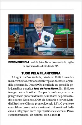 Ressaltando a benemerência do líder da LBV, o periódico apresentou matéria intitulada: “Tudo pela Filantropia”. O conteúdo enaltece o amplo trabalho realizado por Paiva Netto, bem como todo legado de Fé, Perseverança e Solidariedade.