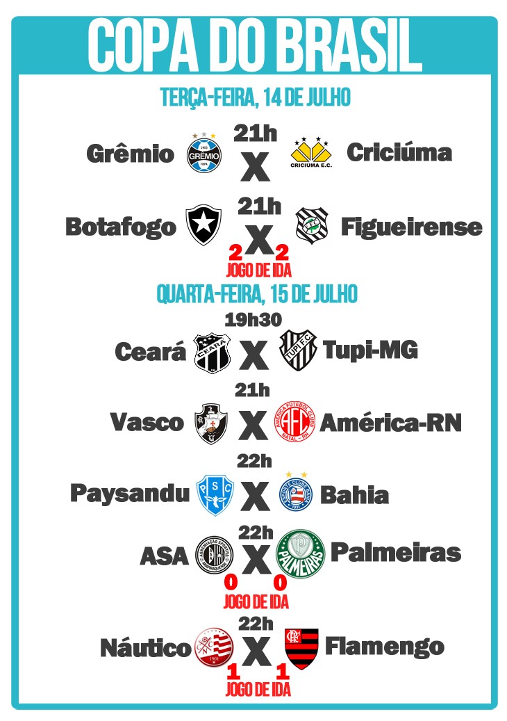 O Flamengo joga a partida de volta contra o Náutico no dia 15, na Arena Pernambuco. No mesma data, o Palmeiras faz o segundo jogo diante do ASA. Santos e Sport jogam a partida de volta no dia 22.  No jogo de ida, o Leão venceu por 2 a 1. Confira a tabela com os próximos jogos previstos: