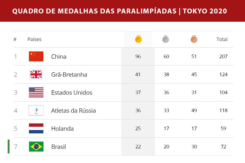 O Brasil terminou os Jogos Paralímpicos com a melhor campanha da história. Igual ao número de medalhas da última edição no Rio de Janeiro em 2016. Foram 72 no total na ocasião e agora também. Além disso ficou na 7a colocação, a mesma de Londres 2012. E o principal ainda foi quebra do recorde de medalhas de ouro. Naquela oportunidade foram 21 medalhas de ouro e dessa vez o país subiu ao lugar mais alto do pódio 22 vezes.
