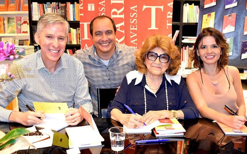 Na concorrida noite de autógrafos, Maria Eugênia de Castro autografou livros ao lado de seus colaboradores Luiz Augusto Figueira e Fernanda Miguez. De camisa cinza, está Alziro de Paiva, representando o diretor-presidente da LBV na ocasição.