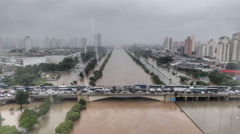 Vista aérea da Marginal do Tiête, altura da Ponte da Casa Verde, em São Paulo/SP, com forte trânsito e centenas de pontos de alagamento.