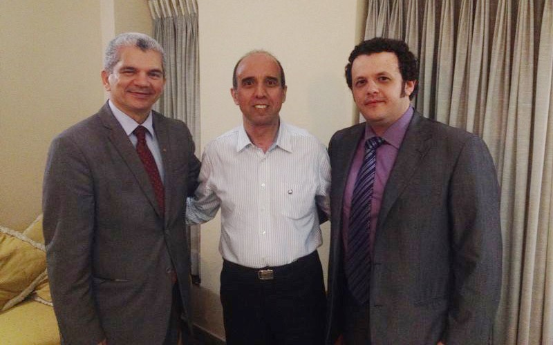 Os escritores e advogados dr. Gilberto Garcia (E) e dr. Antônio Carlos da Rosa (D). Ao centro o pregador-ecumênico da Religião de Deus, do Cristo e do Espírito Santo, dr. Octávio Pereira Caldas Neto, também advogado.