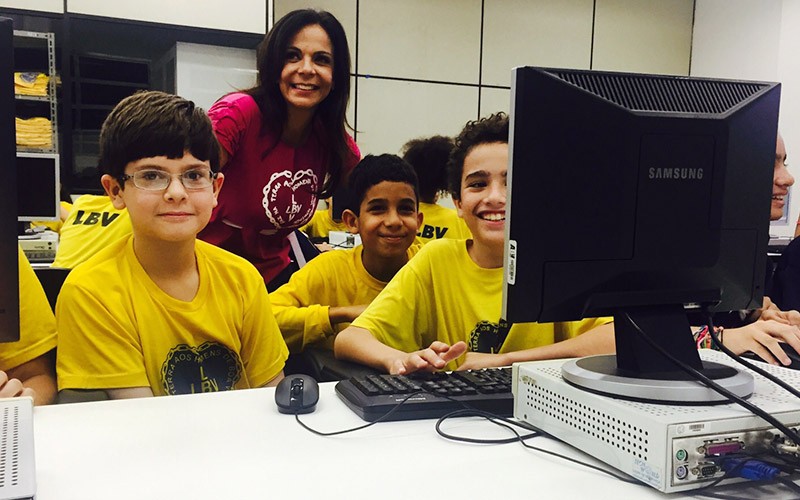 A cantora participou de algumas das aulas do Conjunto Educacional Boa Vontade. Na foto, ela posa com alguns dos alunos durante a aula de informática.