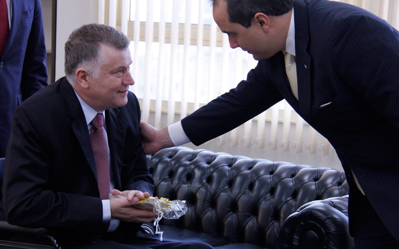 O doutor Marcos da Costa confraterniza com Alziro Paolotti de Paiva, representante do diretor-presidente da LBV, José de Paiva Netto, na ocasião.