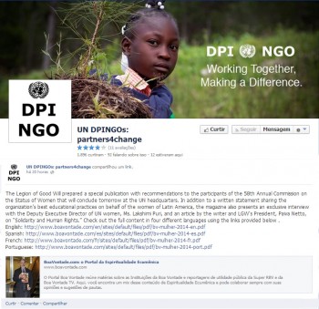 A página oficial do UN DPI/NGO (Departamento das Nações Unidas de Informações Públicas para ONGs) no Facebook divulgou nesta quinta-feira, 20, a revista BOA VONTADE Mulher. Na página, o departamento da ONU disponibiliza para leitura os links das quatro versões da publicação e destaca o seu conteúdo: "Além de uma declaração por escrito, compartilhando as boas práticas educacionais da organização, em nome das mulheres da América Latina, a revista apresenta também uma entrevista exclusiva com a vice-diretora-executiva da ONU Mulheres, a sra. Lakshimi Puri, bem como um artigo do escritor e presidente da LBV, Paiva Netto, intitulado 'Solidariedade e Direitos Humanos'".