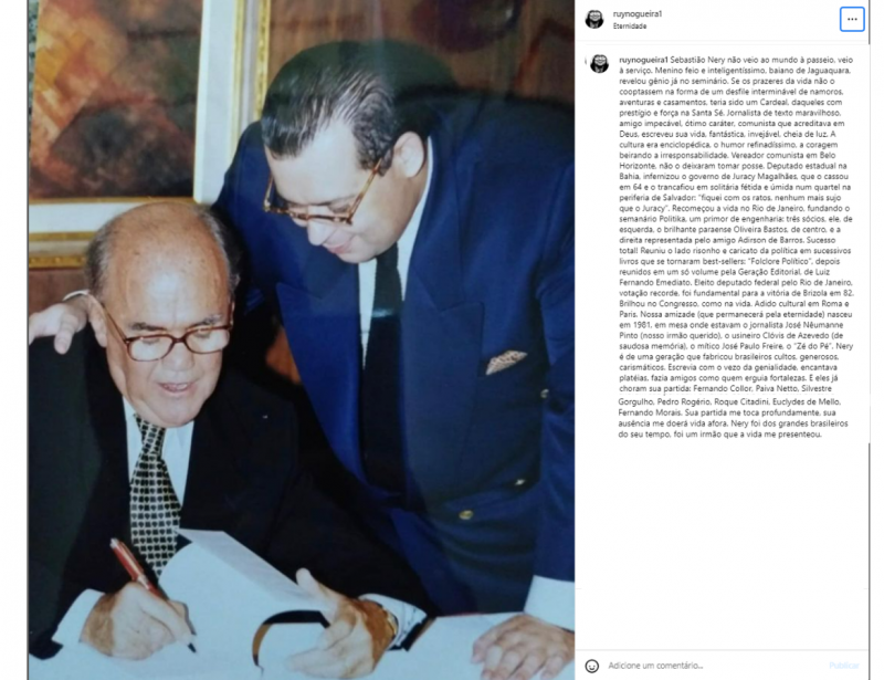 "Sebastião Nery não veio ao mundo à passeio, veio à serviço. Menino feio e inteligentíssimo, baiano de Jaguaquara, revelou gênio já no seminário. Se os prazeres da vida não o cooptassem na forma de um desfile interminável de namoros, aventuras e casamentos, teria sido um Cardeal, daqueles com prestígio e força na Santa Sé. Jornalista de texto maravilhoso, amigo impecável, ótimo caráter, comunista que acreditava em Deus, escreveu sua vida, fantástica, invejável, cheia de luz. A cultura era enciclopédica, o humor refinadíssimo, a coragem beirando a irresponsabilidade. Vereador comunista em Belo Horizonte, não o deixaram tomar posse. Deputado estadual na Bahia, infernizou o governo de Juracy Magalhães, que o cassou em 64 e o trancafiou em solitária fétida e úmida num quartel na periferia de Salvador: “fiquei com os ratos, nenhum mais sujo que o Juracy”. Recomeçou a vida no Rio de Janeiro, fundando o semanário Politika, um primor de engenharia: três sócios, ele, de esquerda, o brilhante paraense Oliveira Bastos, de centro, e a direita representada pelo amigo Adirson de Barros. Sucesso total! Reuniu o lado risonho e caricato da política em sucessivos livros que se tornaram best-sellers: “Folclore Político”, depois reunidos em um só volume pela Geração Editorial, de Luiz Fernando Emediato. Eleito deputado federal pelo Rio de Janeiro, votação recorde, foi fundamental para a vitória de Brizola em 82. Brilhou no Congresso, como na vida. Adido cultural em Roma e Paris. Nossa amizade (que permanecerá pela eternidade) nasceu em 1981, em mesa onde estavam o jornalista José Nêumanne Pinto (nosso irmão querido), o usineiro Clóvis de Azevedo (de saudosa memória), o mítico José Paulo Freire, o “Zé do Pé”. Nery é de uma geração que fabricou brasileiros cultos, generosos, carismáticos. Escrevia com o vezo da genialidade, encantava platéias, fazia amigos como quem erguia fortalezas. E eles já choram sua partida: Fernando Collor, Paiva Netto, Silvestre Gorgulho, Pedro Rogério, Roque Citadini, Euclydes de Mello, Fernando Morais. Sua partida me toca profundamente, sua ausência me doerá vida afora. Nery foi dos grandes brasileiros do seu tempo, foi um irmão que a vida me presenteou", escreveu.