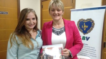 A Deputada Estadual Luciane Carminatti (à direita) recebe da representante da LBV a revista Boa Vontade Mulher