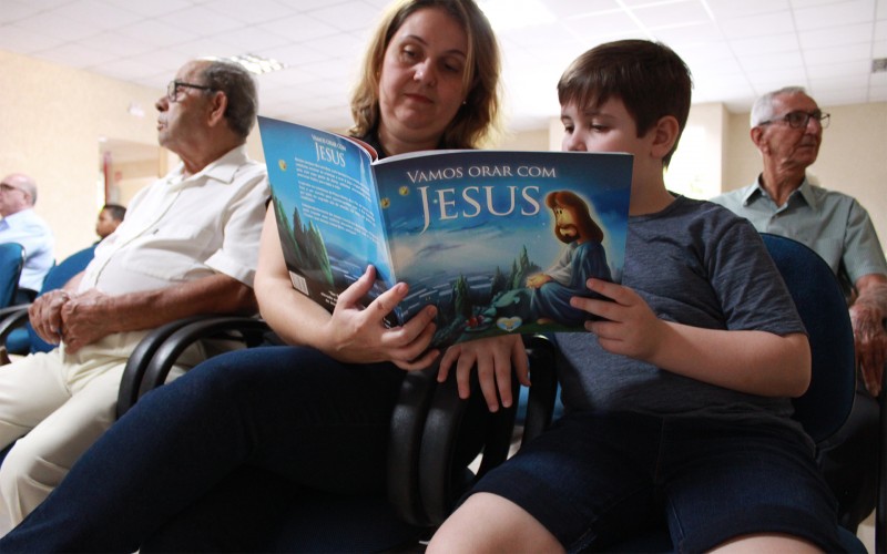 Araçatuba, SP — Durante a solenidade do 17º Fórum Internacional dos Soldadinhos de Deus, da LBV, famílias acompanham à leitura com as crianças do novo livro “Vamos orar com Jesus”.
