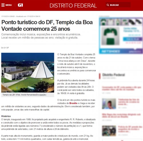A matéria ressaltou o propósito ecumênico do Templo da Paz, pontuando ainda que o monumento é o mais visitado da capital federal, segundo dados da Secretaria de Turismo do DF, e uma das Sete Maravilhas da cidade.