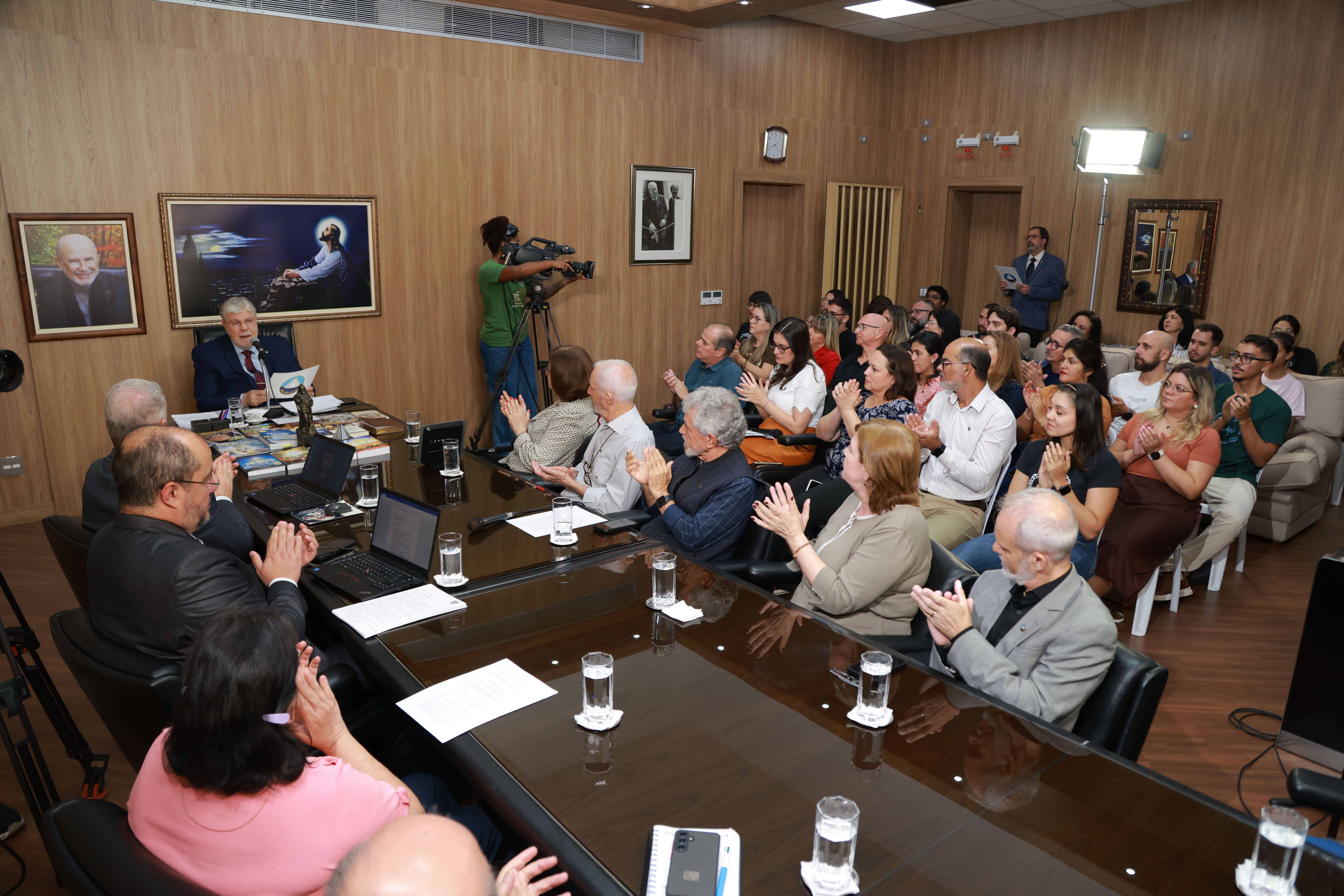 Na sequência, o presidente realizou a leitura de conteúdos da Doutrina Ecumênica da Religião de Deus, do Cristo e do Espírito Santo e passagens Bíblicas, promovendo um momento de reflexão e conexão espiritual com o público que acompanhava pelas plataformas digitais, televisão e rádio. Na ocasião, também prestou uma homenagem aos Legionários da Boa Vontade, destacando a dedicação e o compromisso de cada um na construção de uma sociedade mais justa e fraterna.