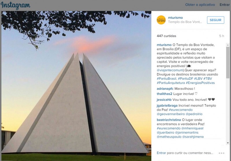 Monumento turístico mais visitado da capital federal, de acordo com a Secretaria de Estado de Turismo do DF (Setur), e uma das Sete Maravilhas de Brasília, o Templo da Boa Vontade ganhou destaque nesta quarta-feira, 10, no perfil no Instagram do Ministério do Turismo. Claro que a beleza que faz bem à alma da Pirâmide da Paz não poderia ficar de fora desta rede social conhecida pelo compartilhamento de imagens. Aliás, vários lindos cliques são compartilhados sempre pelos que peregrinam ao local, veja alguns que o Portal Boa Vontade listou =)