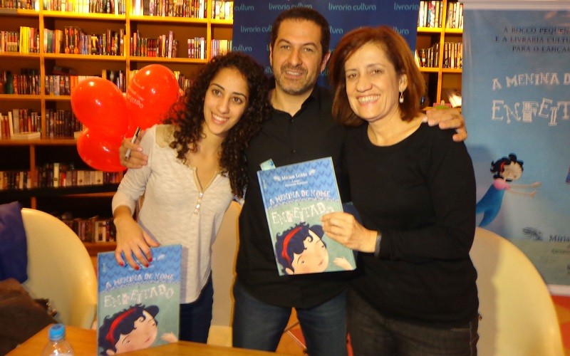 Nathália Leitão, jovem que inspirou a autora; o ilustrador Alexandre Rampazo, e a jornalista Míriam Leitão.