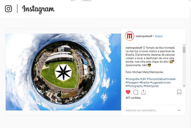 O Portal de notícias Metrópoles do Distrito Federal divulgou nesta terça-feira, 30, em seu perfil oficial no Instagram uma foto em 360º do Conjunto Ecumênico da Boa Vontade, formado pelo ParlaMundi da LBV, prédio administrativo e Templo da Boa Vontade (TBV), a Pirâmide das Almas Benditas e dos Espíritos Luminosos, para saudar seus seguidores.