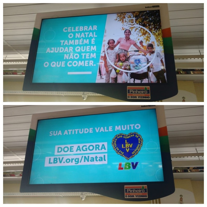 A empresa Indoor Channel está divulgando a Campanha de Natal da LBV em 22 cidades do estado do Ceará, além da capital Fortaleza. Ao todo, são 463 pontos (supermercados, academias, lotéricas, salão de beleza, clínicas, elevadores) com 50 inserções ao dia.