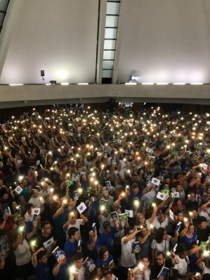 Peregrinos presentes no TBV iluminam ambiente com seus celulares, enquanto entoam músicas legionárias, durante a sessão solene dos 29 anos do Monumento! Pura emoção!!